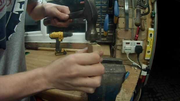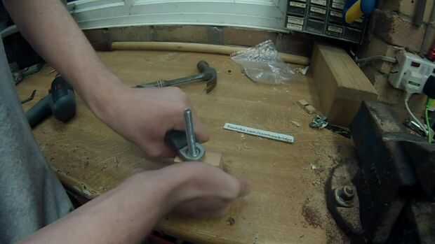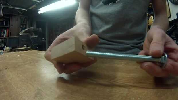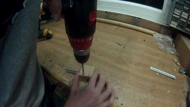 Primero corté un poco de haya aproximadamente 40 x 40 y luego perforé un agujero ligeramente compensado para aceptar un perno de coche entonces apretó él abajo con una tuerca y una arandela luego condujo en dos tornillos de cabeza de arandela, utilicé algunos tornillos de chapa tenían una cabeza plana para un agarre en la tapa de la botella pero llevó un mientras que para ellos debido al perfil taladre metal en el extremo.