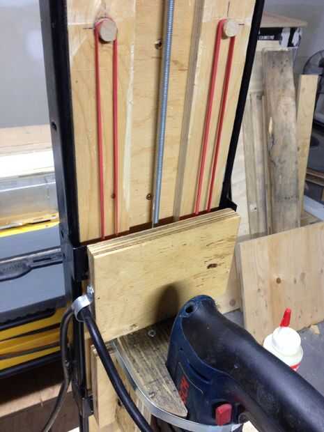 He probado también la suspensión de goma: normalmente el taladro es bastante pesado, pero con cuatro bandas de goma asomará alrededor de una pulgada por encima de la superficie de la mesa. Fácilmente se empuja hacia abajo o retraída. ¡ Un éxito!