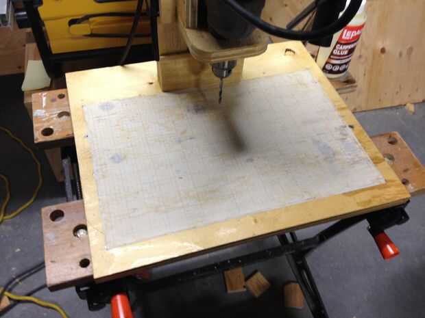 Pegué una hoja de papel con una cuadrícula cuadrada de 1/4" en la base; después sellé la base con un poliuretano de capa clara. Esto fue pegado en con pegamento para madera que extendió con una pieza de madera de desecho como una escobilla de goma. Esto me ha ayudado Alinee materiales y asegurarse de que yo soy de perforación en el lugar correcto.