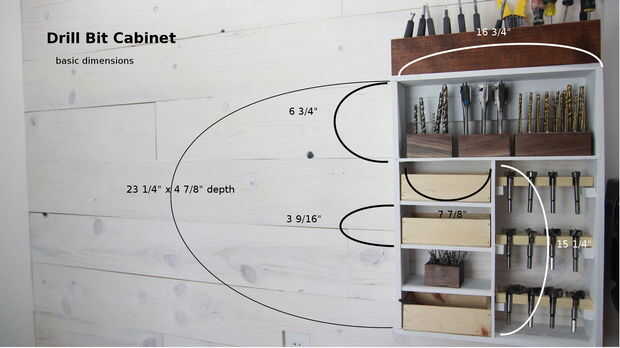 Este es un proyecto bastante fácil de construir. Es una caja básica, colgado en la pared con un taco francés. Dentro de la caja hice unas cajas más pequeñas para sostener algunos de los bits y unos ganchos para sujetar las brocas más grandes.