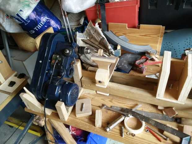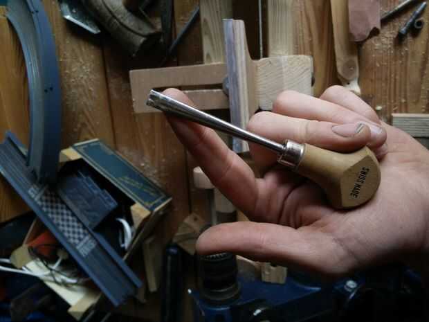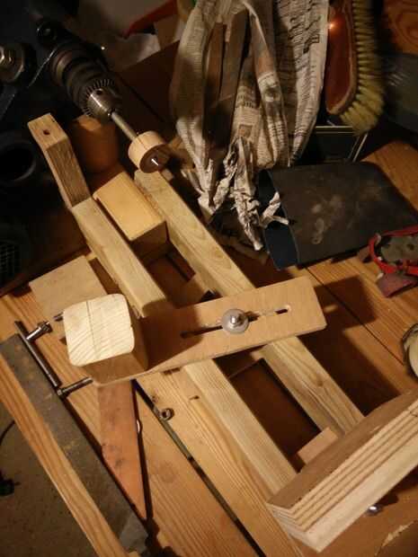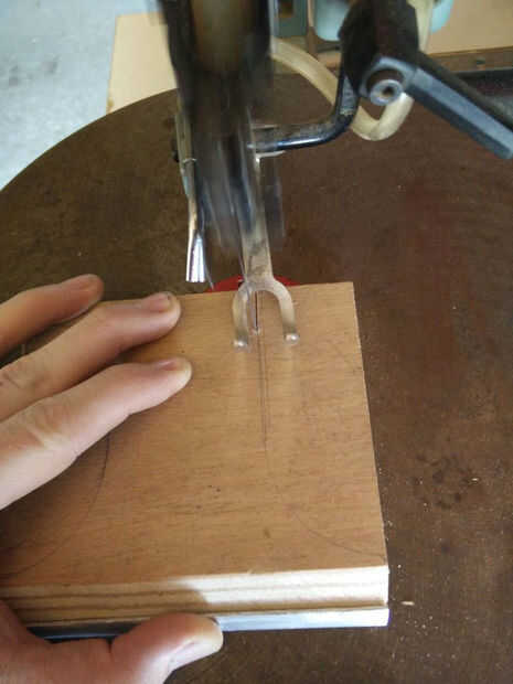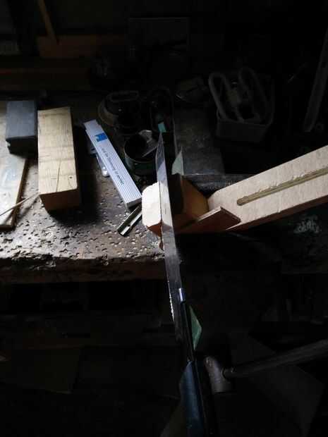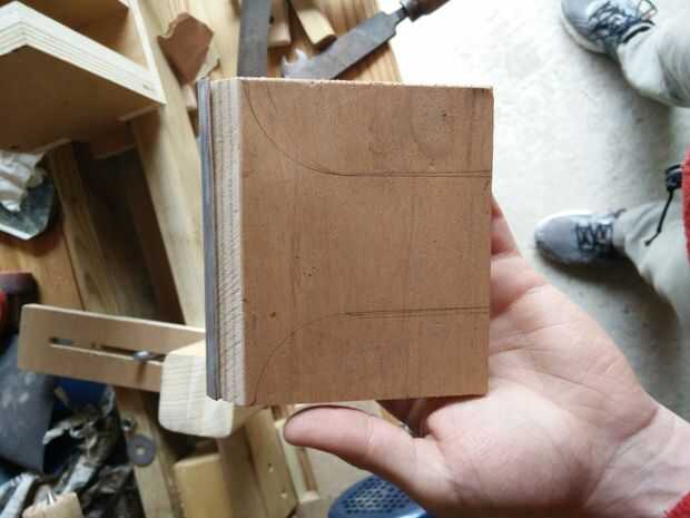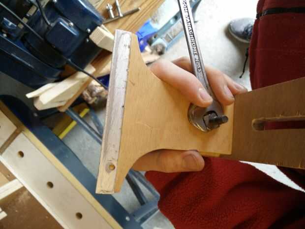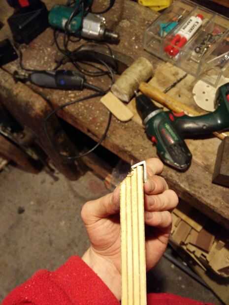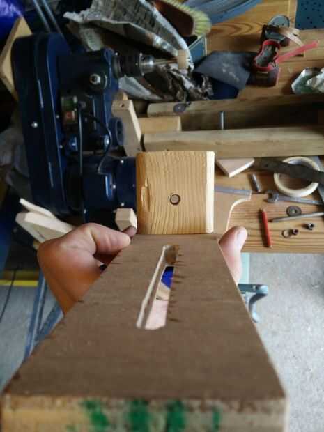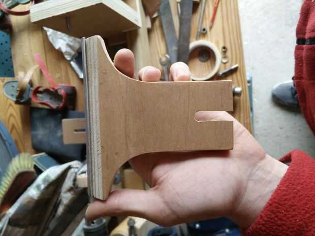 Se hace de tres piezas de madera: una plana para la barandilla, el resto de la herramienta real que está hecho de madera contrachapada, corte a 45 ° centígrados en la Sierra de mesa y pasamano de aluminio martillado a 45 ° y ajustaron a la madera contrachapada y un bloque para unir las dos piezas.