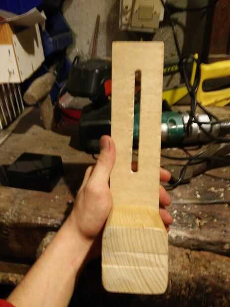 Para hacer la ranura, sujeta una pieza recta de madera como guía y había perforado a través de todo el camino y alisa el interior de la ranura con una Lima.