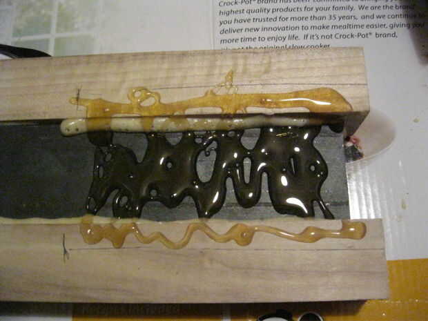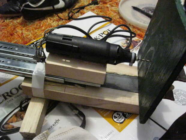 Una vez que todo esto ha pegado, y el conmutador para el dremmel se retira (si quieres que sea), luego proceder. Localizar las partes importantes de la dremmel: encendido / apagado (si aún montada), el botón de liberación de bloqueo de chuck (situado en la parte inferior de la dremmel) y el ajuste de la velocidad (si existe). Asegúrese de que todos estos se enfrentan a hacia fuera y no de ser enterrado en pegamento. A continuación vas a pegar encima el dremmel por un solo lado y mantenerla derecha en el separador de 2 x 4. Tal vez sería una buena idea en lugar mientras que es secado para asegurarse de que no cambie de puesto alrededor de la cinta.