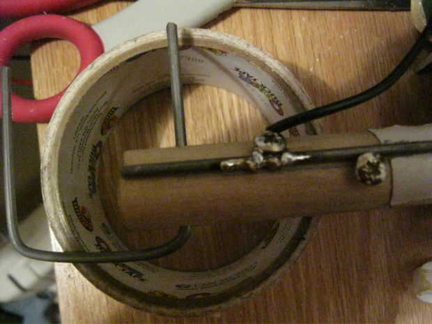 Solía una varilla metálica doblada que encajan en dos agujeros en el lado del taladro hacen el perno de la palanca. Las fotos hacen un mejor trabajo explicando la forma que desee. Hacer algo similar para instalar el segundo contacto pin (el pin que bajará la palanca para empujar el dremmel). Para fijar los pernos en las posiciones correctas, un taladro y llenarla en algunos pegamento del gorila y apuñalar en el perno para bien.