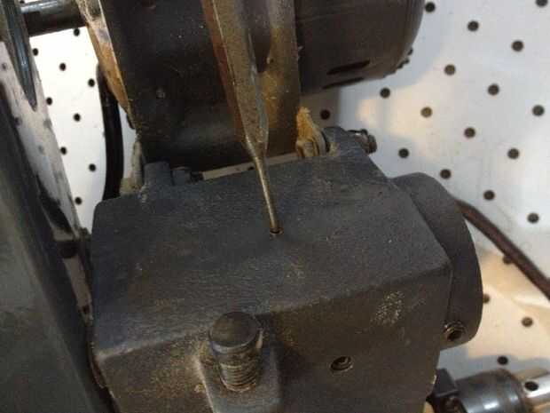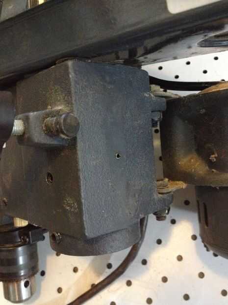 Oscilación del motor fuera de su posición habitual. Escondido por el motor es un pasador que se detiene la columna de ir todo el camino a través de la cabeza del taladro. Presione el pasador hacia fuera con un sacador del perno y un martillo.