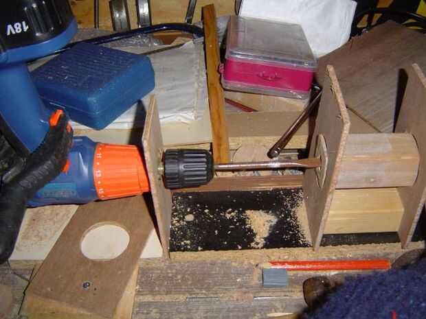 Finalmente utilicé un trozo largo de madera para hacer una cama para toda la cosa, con una tira atada a la espalda de él para se deslice contra la titular de la acción. El soporte del taladro fue atornillado a esta. He podido trabajar con más precisión esta manera.