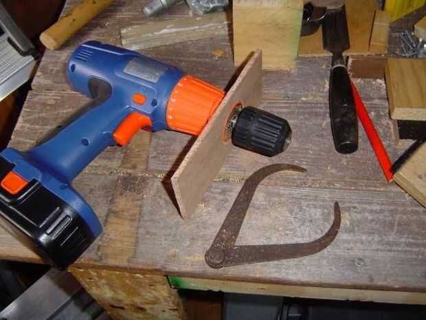 Cortar un agujero suficientemente grande para contener cómodamente el collar del taladro. Tornillo de esta pieza a la pieza del tablero que es sólo un poco más corta que el cuerpo del taladro (placa base).