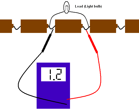 Desde que el taladro llegó con dos paquetes de baterías, puedo combinar las buenas para hacer un segundo paquete de trabajo. Las células viejas se pueden probar como se muestra a continuación - la parte importante que aquí es la carga. He utilizado una bombilla de linterna como una carga que servidor también como un indicador visual de carga de la batería. Sin la carga de la prueba dará resultados inútiles. He visto algunas células leer 1,2 voltios sin una carga--que parece buena, pero la gota a 0,3 voltios cuando la carga se agrega--claramente un fracaso.