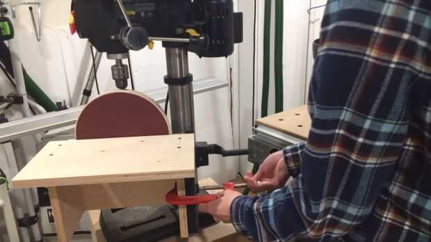 90 grados de inclinación de la mesa del taladro y asegure la lijadora de disco con una abrazadera del lado.