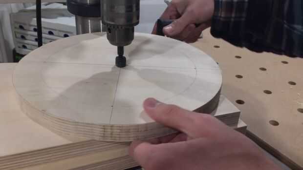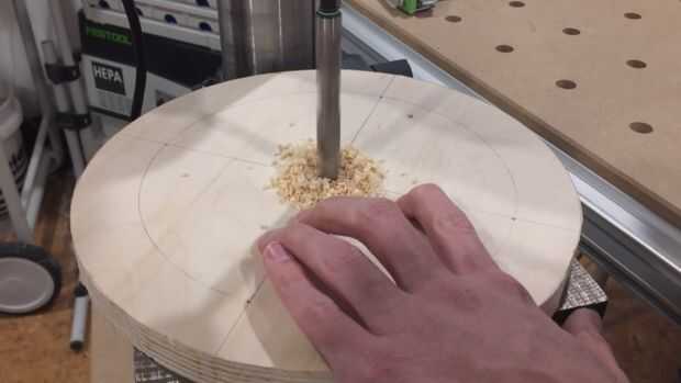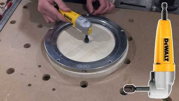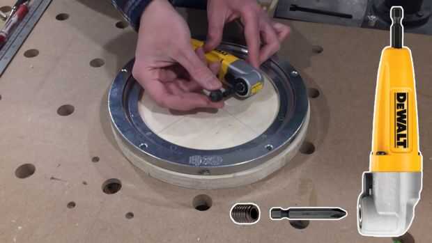 Prensa de taladro -> adaptador de ángulo recto -> 2" bits -> 1/2" tornillo de ajuste -> papel de lija (y un cojinete de lazy Susan tiene el disco de lija en su lugar).
