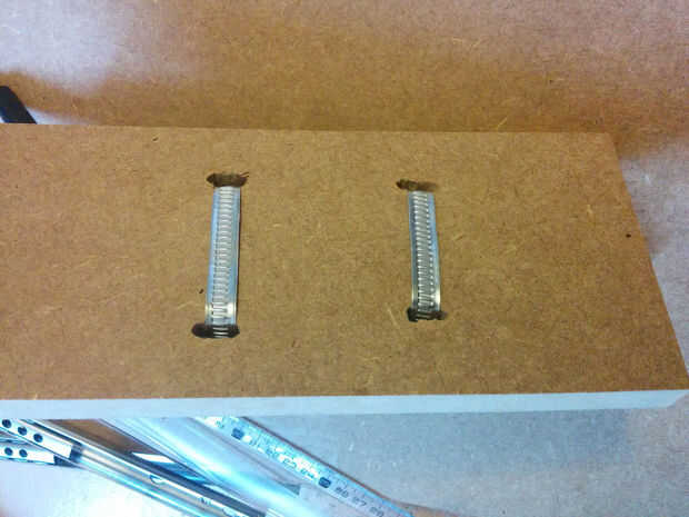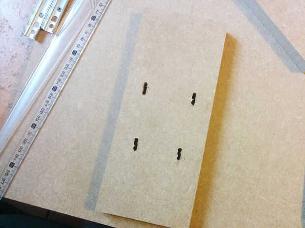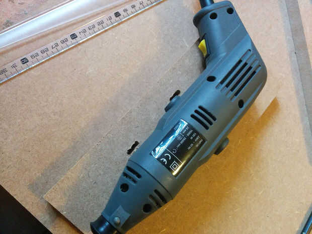 • Poner tu mini taladro en la parte MDF y centro bien. Con el lápiz, dibujar los agujeros y luego taladro como en la fotografía. (No puedo decirte las dimensiones, informa a tu forma de mini taladro)