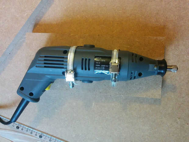 • Ahora que tiene 4 agujeros en la pieza MDF, sujete el taladro mini con las abrazaderas de manguera. Asegúrese que las abrazaderas de manguera plana en la parte de atrás.