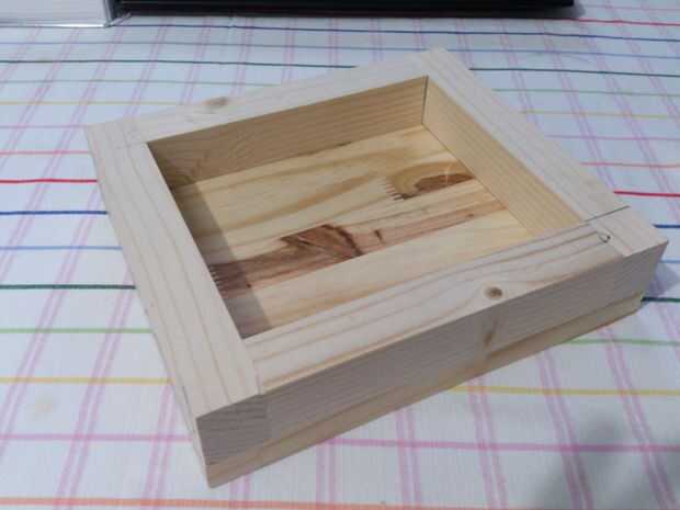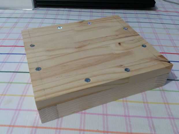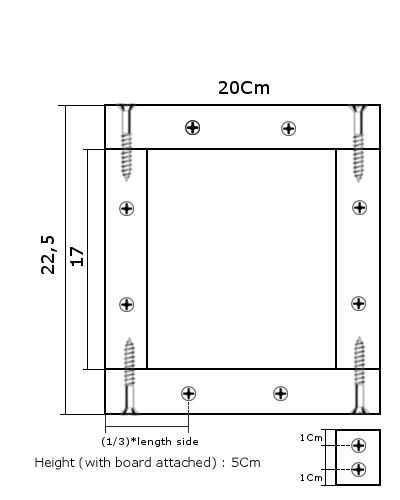 Para colocar la cubierta, sólo dibuje el contorno sobre un tablero de madera, corte y fíjelo al marco del listón con tornillos, puse 2 en cada lado, dejando una separación entre ellos de aproximadamente 1/3 la longitud de ese lado. Si eres como yo, las posibilidades son algunas de las tablillas o piezas del tablero sobresalga ligeramente de la forma que buscamos, así que agarra ese papel de lija de 80 grano o una herramienta equivalente y comienzo lijado hasta que los bordes son totalmente planos.