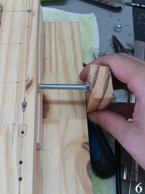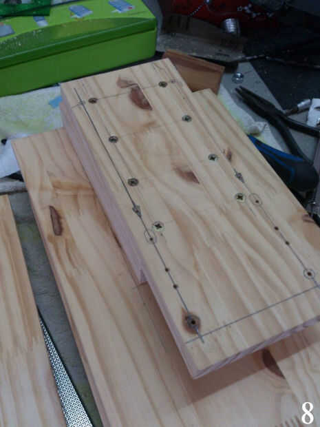 Para atornillar el tablero a los espaciadores tenemos que seguir un procedimiento especial, esta placa debe ser perfectamente paralela respecto la junta grande, para ello hice una simple pero eficaz herramienta para alinear la placa (foto 6), deslice a lo largo el borde plano de la Junta y compruebe que el tornillo siempre es tocando el tablero pequeño , una vez que la junta esté alineada fijarlo con la abrazadera en su lugar, perfore los orificios y sin quitar la abrazadera Inserte los tornillos (foto 7 y 8).