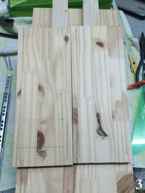 Con las líneas que definen la posición de las guías les coloco las líneas más tiempo pasan por en medio de los agujeros, luego, con el lápiz marca la forma de los orificios, y los perfore la madera (foto 4).