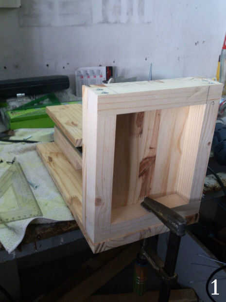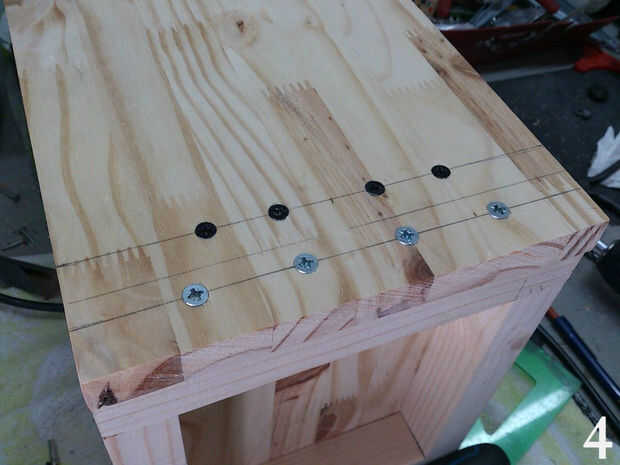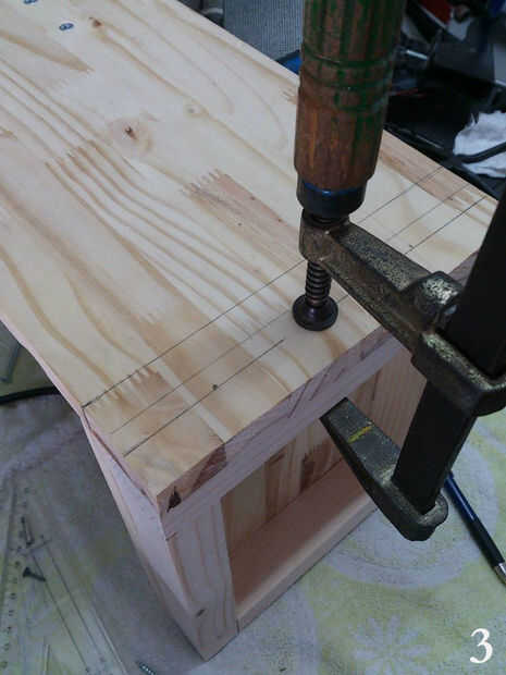 Una vez que la base esté alineada con las guías la sujete fuertemente, y marcamos los lugares donde los tornillos será unida (Foto 3), asegúrese de que usted no consigue en la manera de un tornillo previamente los lugares. Para hacer las líneas I divide la longitud de la Junta de listón y por dos, esa manera estoy seguro de que los tornillos pasará por el centro de ellos, en mi caso puse 4 tornillos largos para arriba (en el listón) y 4 cortos (en el tablero) (foto 4), esto es sólo temporal.
