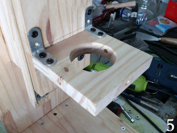 Me marca un punto en el centro de cada lado, luego con una broca de madera de 6mm que perforar agujeros a través de ellos, los tornillos para sujetar las herramientas irá allí (Foto 5).