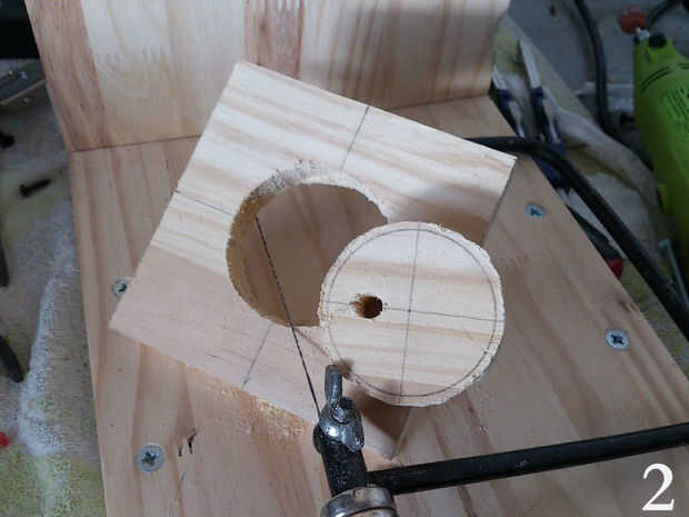 Corté la última pieza de madera, entonces hago un agujero aunque, no estoy muy orgulloso de cómo salió ese agujero, Sierra de joyero y madera gruesa no consiguen adelante, pero que es fácil de solucionar con papel de lija envuelto alrededor de un tubo (Foto 1 y 2). El diámetro del agujero es el diámetro de la broca de alta velocidad ya que es la mayor herramienta que va a utilizar.