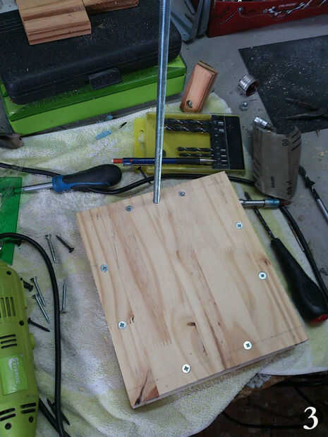 Para poder hacer agujeros a la misma altura necesitaremos a algún tipo de tope ajustable. He utilizado una varilla de 8mm (M8) roscado, he cortado a una longitud de 50 Cm y lijado un extremo para darle forma redonda y a opacar el hilo un poco (Foto 1). A continuación hago un agujero en la base (Foto 2), el agujero debe ser lo suficientemente grande como para dejarla girar libremente pero no ser flojo (Foto 3).