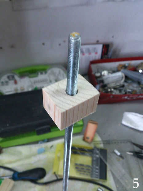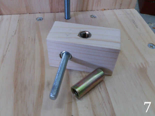 Con un bloque pequeño de madera un tornillo largo y un tubo de roscado hacer un tapón (foto 7). Que tocando a la Junta, así que cuando gire la varilla va arriba y abajo poner un límite para la herramienta con mucha precisión (Foto 8). También he añadido un pequeño botón rojo de la barra para que sea más fácil girar.