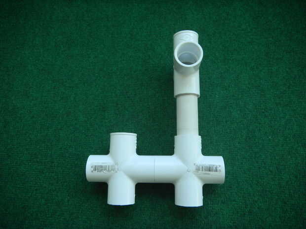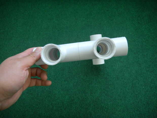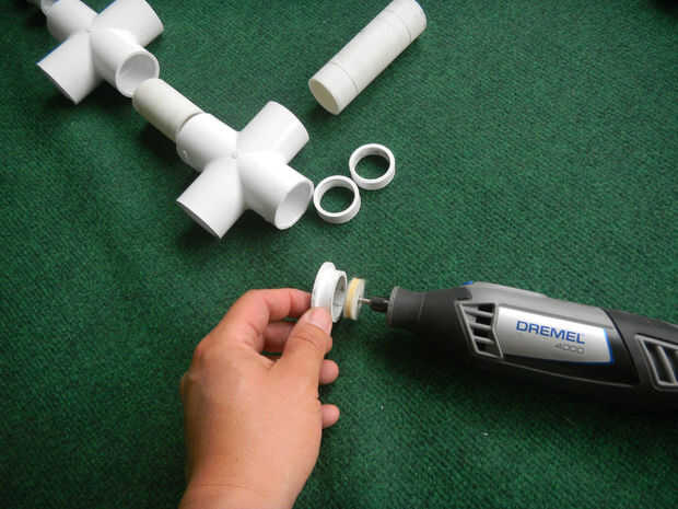Corte dos 1 "x 3/4" casquillo a tres piezas como el cuadro demostrado. Necesitamos sólo la pieza superior y 2 º pieza. Pulir su diámetro interno con Dremel hasta que pueden muy fácil diapositiva en la que dos polos (tubo de 3/4"). Pegamento y cruces de 1" y 1" pipas como cuadros demostrados. Asegúrese de dos cruces son paralelos y el tercero es 90 grados para ellos. Poner esta parte de la diapositiva en los polos.