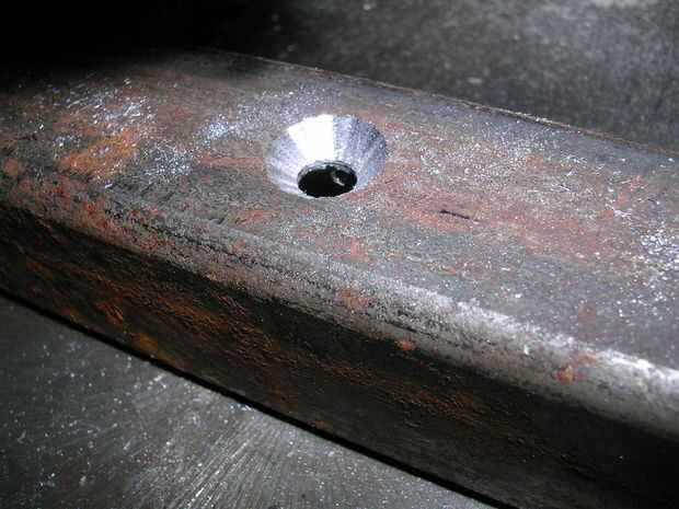 Ahora colocar la broca avellanado y avellanado el agujero, no de gran tamaño del agujero, deje algo del agujero original viable ya que ayudará en el reajuste de la plantilla al siguiente necesita usarlo.