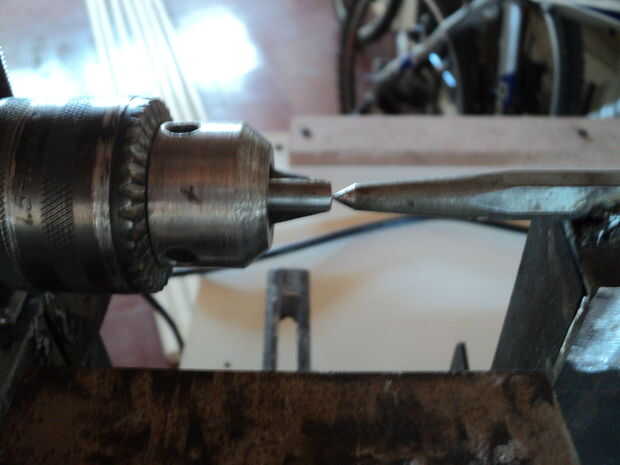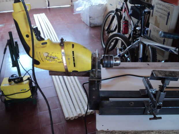 Este es mi primer prototivo de torno para madera. Esta fabricado en hierro angulo de 1pulgado y los medios de comunicación. Es un proyecto un dificil pero el resultado es aceptable. Lo utilizan para realizar una empuñadura para un antiguo formon el cual utilizo para tornear. No se puede esperar un resultado profesional como el de un torno pero si se Desktop pratica se pueden esperar resultados aceptables.