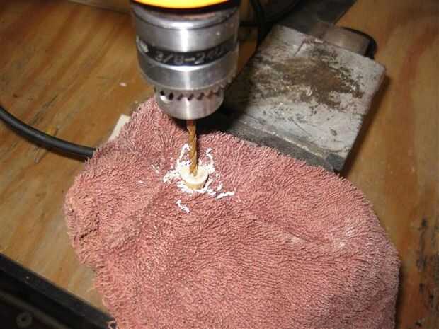Usé un tornillo de banco con una toalla para sostener la cornamenta. Utilizando un taladro eléctrico para poner en un agujero poco profundo, en la parte superior de la pieza de asta de ciervo.