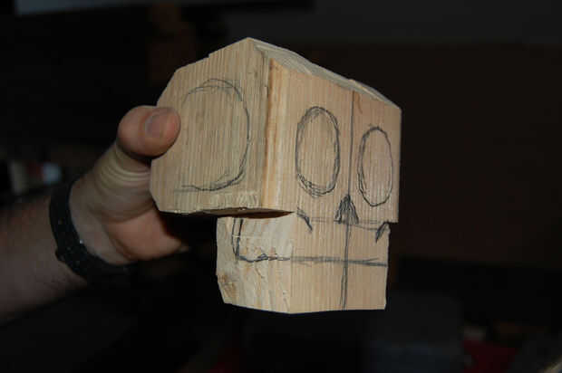 De mi cráneo, empecé a tallar hacia fuera los ojos y ruido junto con detalles en los lados del cráneo.