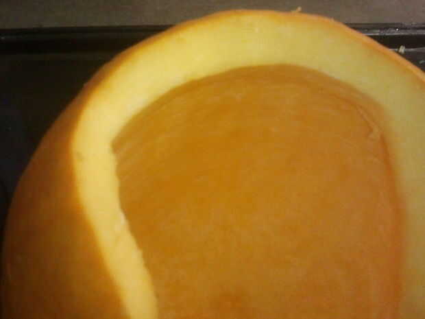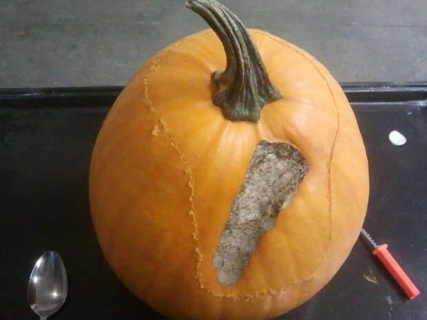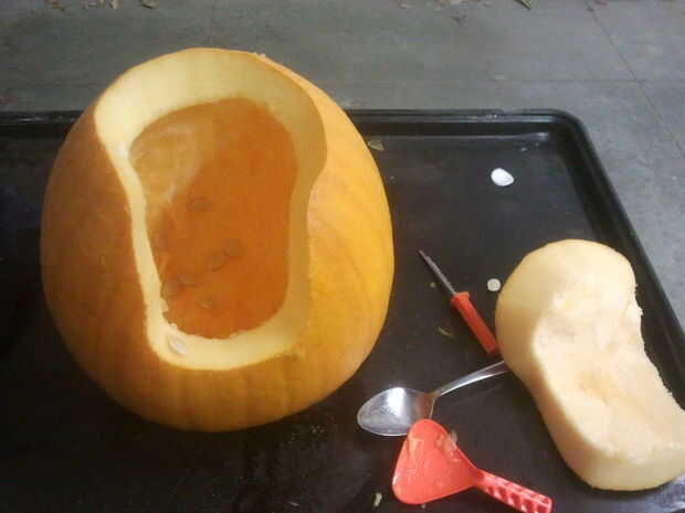 Una vez que la mayor parte de las semillas y cosas "bruto" hacia fuera, usted necesitará mantener raspado. Usted quiere conseguir todo el exceso grueso fuera de él. Me detuve en algún lugar alrededor de las 3/4 - 1 pulgadas de espesor. Las tallas más complejas puede ser que necesite más grueso, pero generalmente no quieren menos de esta cantidad. Usted puede encontrar que la cuchara de sopa funciona mejor para usted (como la calabaza es lo suficientemente grande para él).