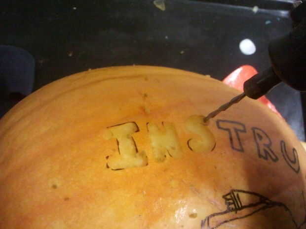 Generalmente tiendo a mantener la herramienta Dremel bastante recta hacia arriba y hacia abajo, pero al hacer grandes áreas o trabajo muy detallado, se volcará al lado. ADVERTENCIA: se trata de cosas desordenado desordenado, así que llevar ropa adecuada y gafas de seguridad. Mina eran manchada cuando termina y secado calabaza frotaciones de ropa bastante fácil.