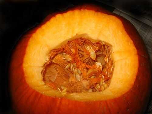 Adelante y con un lápiz, dibuje una línea wide-ish aroung del tallo y hash a alrededor de él con su herramienta afilada. Una vez que has cortado completamente, levante la parte superior y raspar las semillas y las entrañas hacia fuera en un recipiente con el raspador.