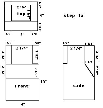 Mida desde la parte delantera del bloque, 1 1/4" y 3 1/2" y esto marca en la parte superior y lados y frente. Trace una línea en los lados en ángulo hasta el borde delantero de la línea que hiciste en el punto 6 pulgadas medido hacia abajo desde la parte superior.