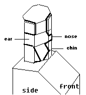 Primero la nariz y la frente. Medida en aproximadamente 1/2" en la ceja marca y hacia abajo desde la parte superior. De 1 1/2" marca una línea en ángulo hacia atrás hasta el nivel de la ceja. Quitar esta madera revelan la frente y la parte superior de la nariz.