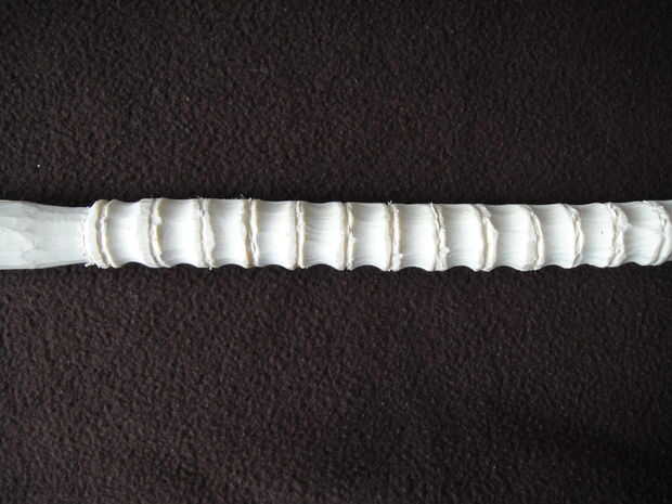 Para las partes curvas de cada vértebra marqué en primer lugar las secciones de aproximadamente 1.25" incrementos. Donde había hecho estas marcas cortar una "V" en forma de surco alrededor para comenzar la forma de la vértebra. Para hacer las curvas entre ellos simplemente usé una gubia a cur alrededor del palillo. La gubia que usé es barrido alrededor #5, no sé la medida exacta porque es una gubia hecha en casa. Estas curvas deben ser alrededor 2/3' rds de la manera alrededor del palillo, dejando espacio para los huesos que sobresalen de la columna vertebral.