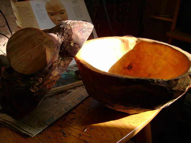 La foto es de una burl que tallada en forma de tazón de fuente. Tomé cuñas triangulares y dispuesto bajo el burl como cuna y sujeta a la mesa (otra técnica increíble para sujetar cualquier cosa redonda que encontré por ensayo y error) su aún más fácil con una manta pequeña debajo del burl o trozo redondo de madera.
