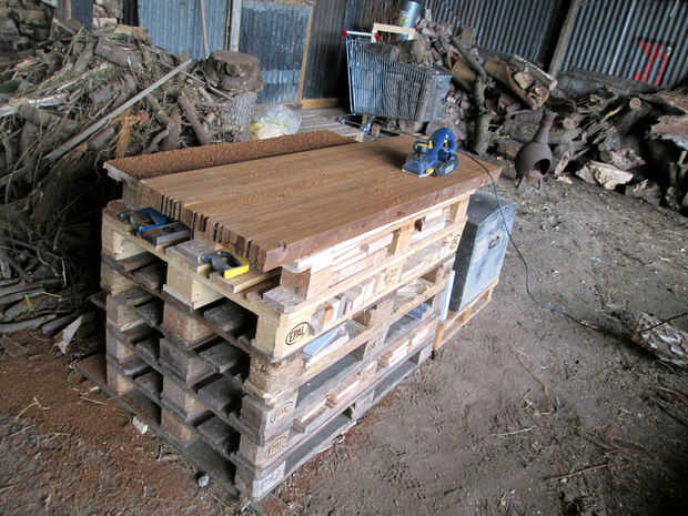 Necesitaba una mesa robusta pero no quería pagar por ella. La palabra clave es paletas - y resultó ser una característica muy útil para almacenar una gran cantidad de madera de desecho, por cierto.