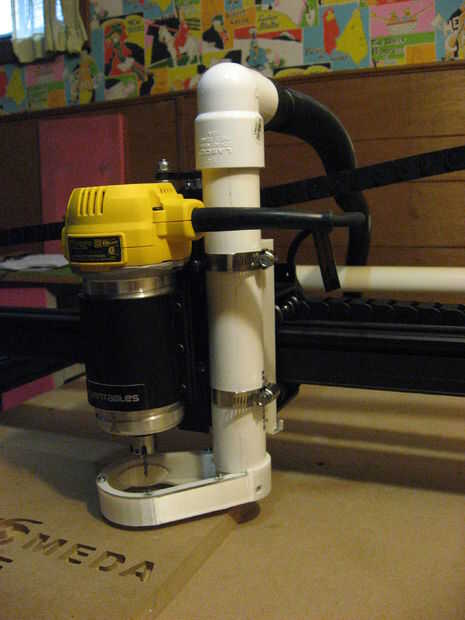 Usted también necesitará agregar una guía en la parte trasera del X-talle para evitar que la manguera de vacío que colgó en la Junta de residuos. Simple utilicé un trozo de tubería de 2" de PVC que tenía por ahí. Esto es fricción muy baja y parece que funciona muy bien. También podría hacer algún tipo de artilugio de la suspensión para mantener la manguera fuera de la mesa, pero que parece excesiva.