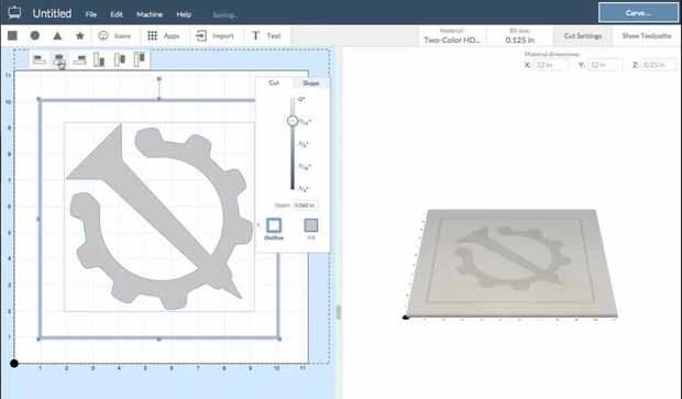Descargar el archivo SVG y luego fui a la Página Web de Inventables y registrado en la solicitud en línea de base. Caballete es cómo controlas la máquina CNC X-talle que tengo. Se puede dibujar directamente en caballete, o puede importar SVG u otros archivos de imágenes o alguna combinación de éstos. Crea un proyecto nuevo, configurar mi dimensiones material e importados la imagen de bandera de clavo y los engranajes de Internet Hola. Escala la imagen más grande, ajuste la profundidad de corte y rodeado con un cuadrado, simplemente para enmarcar y fijar la imagen.