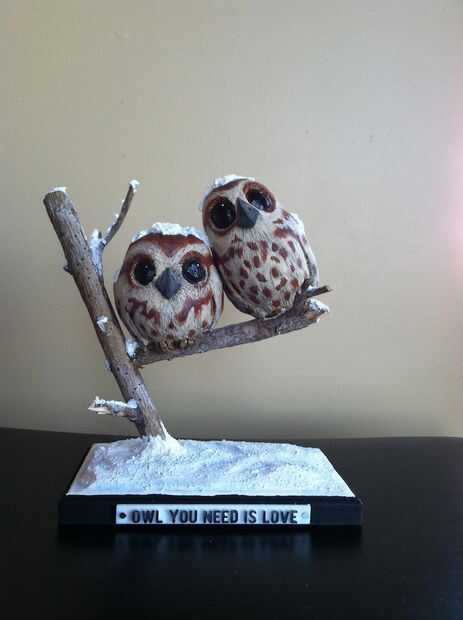 Esta caricatura simple de dos búhos en una escena invernal puede hacerse con unas pocas herramientas de mano y estufa de leña.