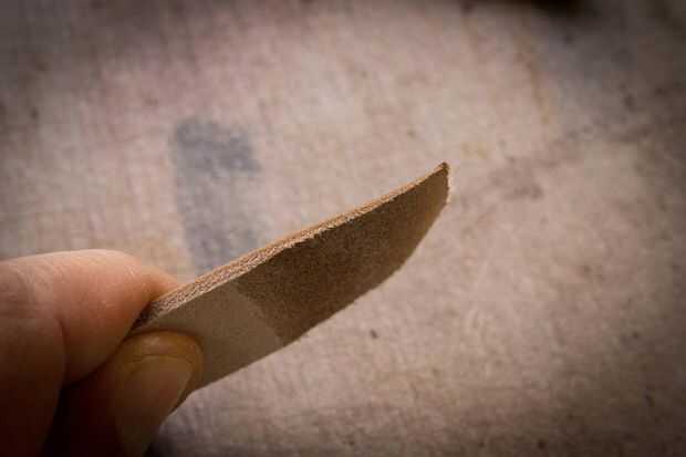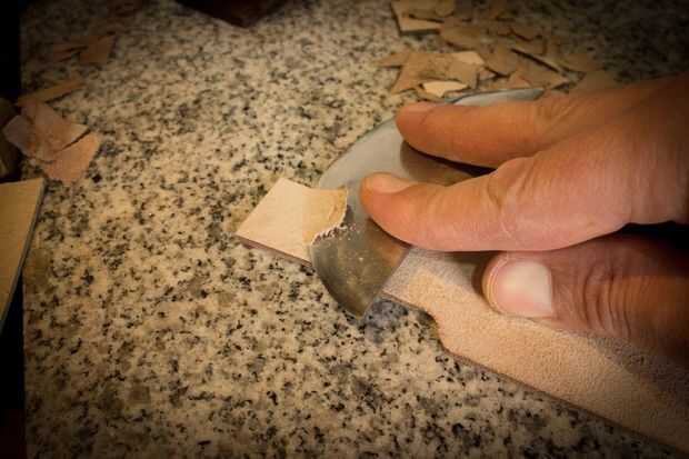 Skive, pare o reducir el grosor de la carne (parte trasera o lado equivocado para que cosa) con un cuchillo afilado. Me gusta usar un cuchillo redondo para trabajar cuero. Esta reducción ayuda a la curva y permite el cierre funcione correctamente.