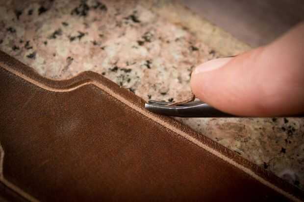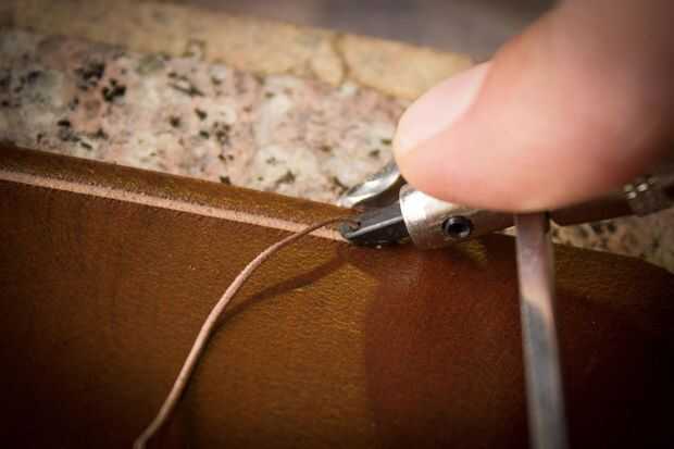 Corte un canal de coser todo el perímetro excepto en el extremo de la hebilla. Biselar bordes.