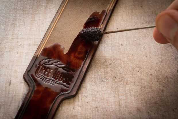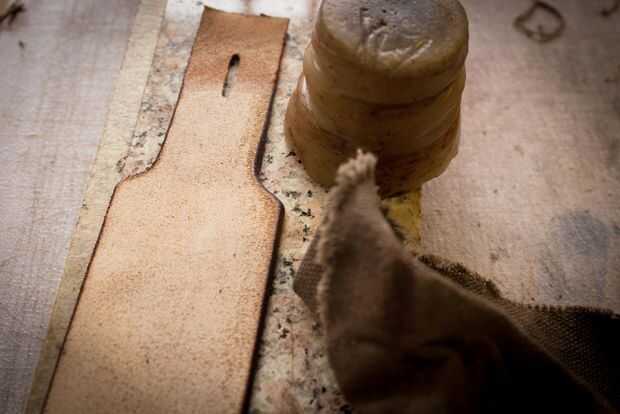 Quería la piel más oscura de lo que era así que poner algún tinte de cuero oscuro en él. Terminar en este punto los bordes con cera de abejas y luego pulir o buff con lona y mucha presión. La fricción y la cera hacen un bonito borde. Suelen hacerlo de ambos lados a partir de la parte posterior. Colóquela sobre un trozo de granito y frotar.