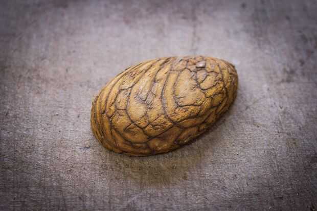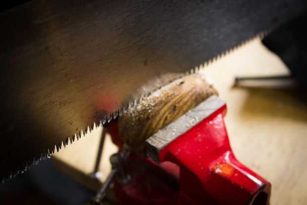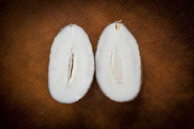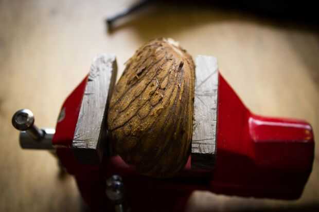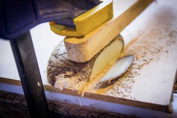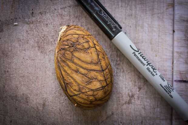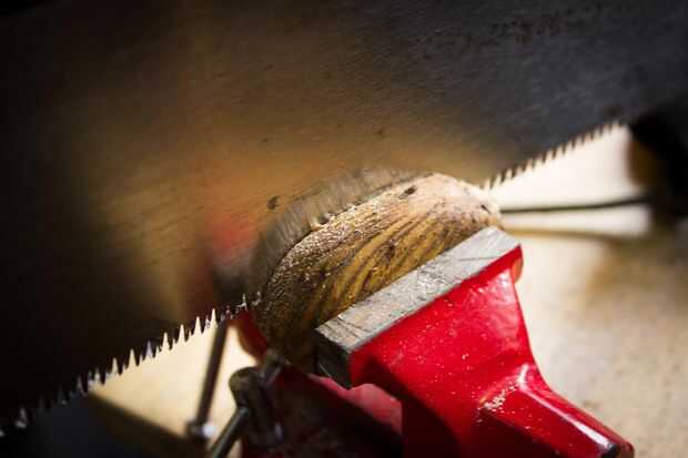 Puede utilizar un tornillo de banco o unas pinzas para sujetar la tuerca. Luego utilice una sierra de dientes finos (me gusta el estilo japonés tire sierras) para cortar en la mitad o en paralelo a una de las superficies. La tuerca no es obviamente una forma geométrica pero hay tres superficies relativamente planas en el exterior. El centro de la tuerca a veces tiene una grieta desde el proceso de secado. Sólo tener esto en cuenta para su diseño. Una vez corte en medio y había cortado un rectángulo de 1 1/8 "X 1 3/8".