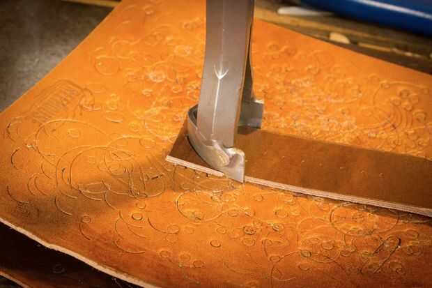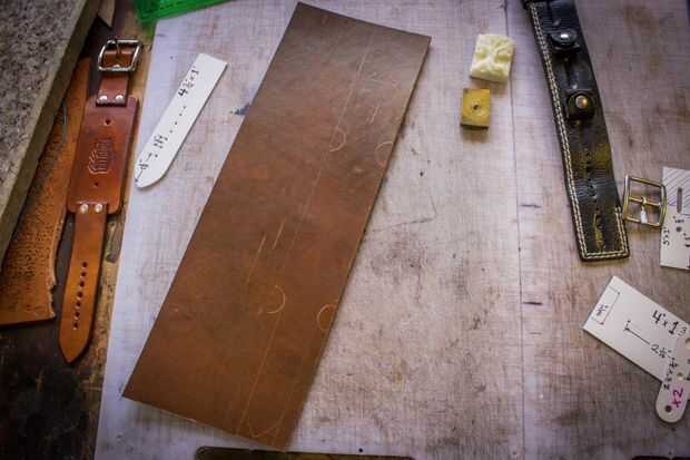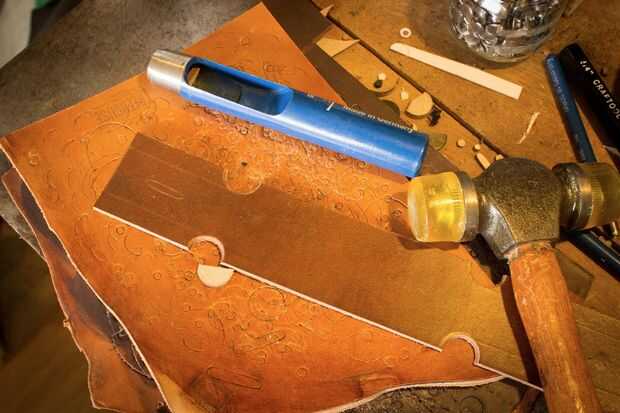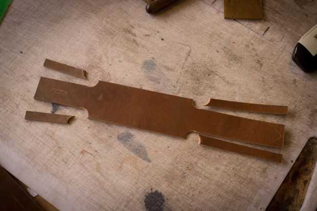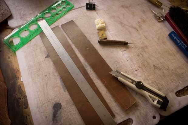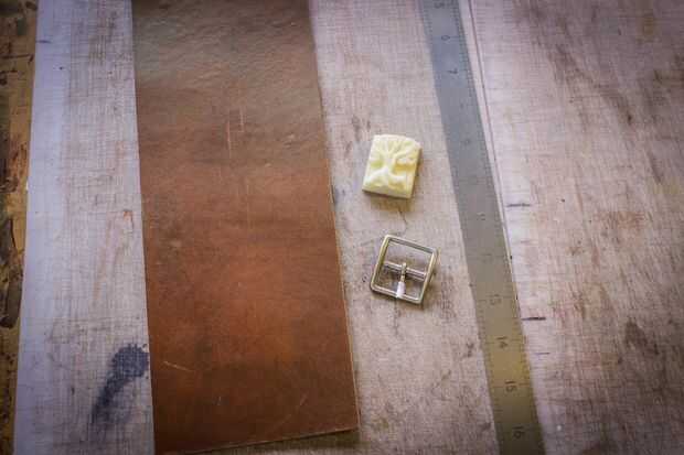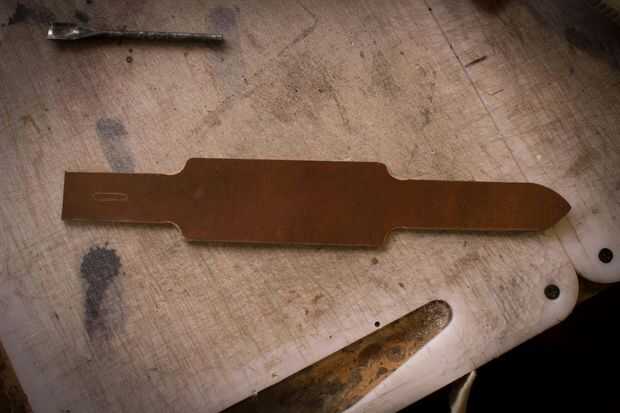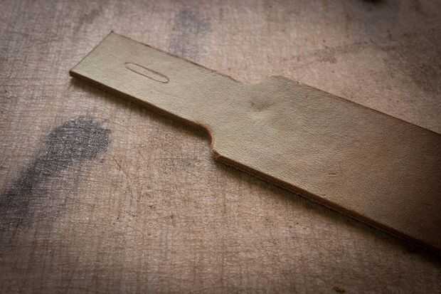Tuve algunos retazos de cuero curtidos de verduras que ya había teñido de colocación alrededor por lo que acababa de usar. El ancho total de la pulsera es 1 3/4" y disminuye a una cinta de 1" en el lado de la hebilla y billete. La longitud total es de 10 1/2" con el pasado 7/8" doblada encima de la hebilla. Aún solo que lo componen como ir aquí... Corte con un borde recto manteniendo mucha presión en él para que no resbale.