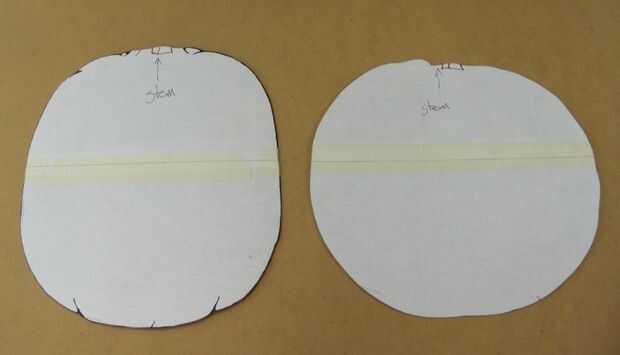 Quería un poco variedad así que elegí dos diferentes formas de calabaza, uno ligeramente más alto y más estrecho y más amplia pero no como de altura. De esta forma que puedo elegir uno que se ajusta el patrón de lo mejor. He encontrado las formas de calabaza en una búsqueda básica en Google imagen. Yo les tamaño a mi aprox. 9" máximo. y les imprime con Paint Shop Pro. (Gimp es una opción gratis) Absolutamente no encajan en la hoja de una letra de tamaño, así que les imprime con líneas de índice por el medio y con cinta juntos después de la impresión. Usé pegamento de aerosol para pegar los cortes calabaza cartulina así que harían una mejor plantilla y luego los recortan con tijeras. (Foto 2) Decidí dejar el tallo en la placa base para que todas las calabazas posterior fáciles de cortar y tallar y también da el producto final un aspecto más 3D. Me remonta a una de cada en la tabla de 1/8" y había cortado en la sierra.