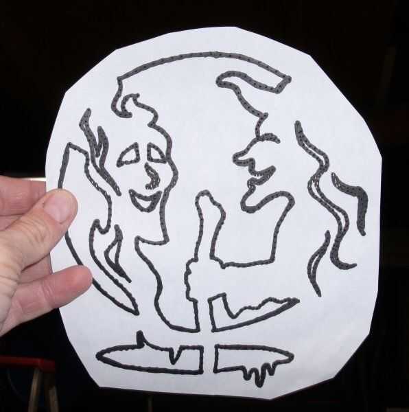 Para el patrón de la bruja (foto 4), todos los puntos perforados con una aguja de coser grande (muy lento), grabó el patrón en el espacio en blanco y luego trazó las líneas con un rotulador negro. La tinta de Sharpie sangró a través de los orificios perforados (Foto 5) y terminó con un bonito patrón de puntos negros para seguir con la Sierra de calar. Como dije, muy desperdiciador de tiempo para perforar los agujeros, pero me gustó el resultado.
