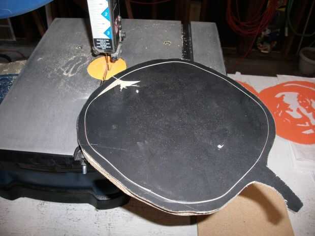 Después de había cortado a 1/8" pieza del vástago, temporalmente lo sobre un pedazo de la 1/2" MDF con dos clavos de acabado con tachuelas y siguió el contorno de la pieza del vástago con la Sierra de cinta para hacer una copia de 1/2" de espesor. Mientras todavía se viró juntos, cortan un punto en la parte inferior y trabajado alrededor de la sierra hasta que pude seguir el borde exterior de 3/8 pulg (Foto 1)