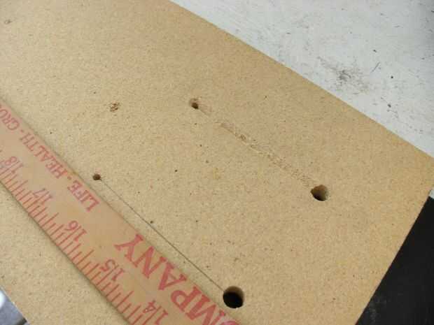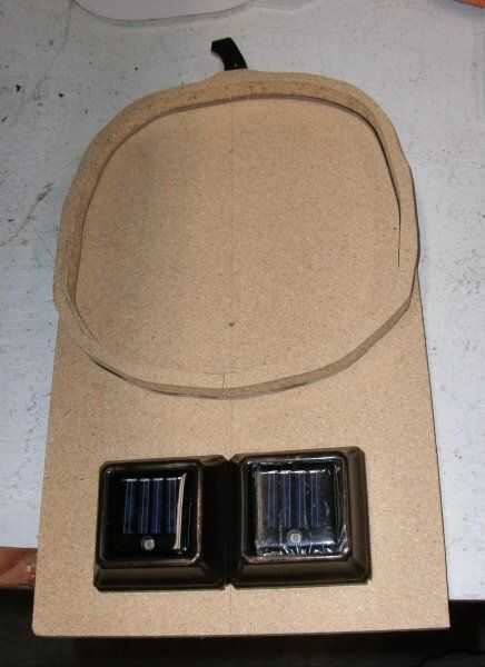 tuve una línea de centro dibujada en mi placa base y yo elegí un lugar donde las células solares parecía buena y centrada y marca su ubicación. (Foto 1) Taladré agujeros en el centro de los lugares de la célula solar para los cables pasar a la parte posterior de la Junta y pequeños directamente sobre y dentro de la forma de calabaza para los cables de retorno dentro de la calabaza para alimentar los LEDs. (Foto 2) A continuación corté una ranura en v poco profunda de cada orificio inferior a su orificio superior en la parte posterior de la placa base para permitir que los cables a ocultar y la placa base para permanecer al ras con la superficie en que colgar. (Foto 3) Usé mi router con una v en forma de bits, sino un surco en MDF se podía cortar fácilmente con un cuchillo o cinceles.
