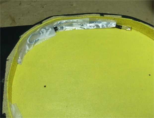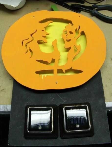 No pude subir con una manera elegante y totalmente invisible temporal para montar los frentes calabaza delgados, pero he decidido que las cabezas de tamaño 4D tres clavos para acabado, una vez que fueron pintados naranja demasiado, no ser una distracción. Perforaron tres agujeros en el borde estrecho, completamente a través de la base, centro de tamaño para un calce para las uñas, dos en la parte superior y uno inferior. Empujé los clavos a través de la parte posterior de la base para que los filos estaban orgullosos del frente, alineados a la cara de calabaza donde quería y golpeada ligeramente la cara para que las uñas marcaron los puntos exactos que necesitaba hacer. (Foto 3) Taladré los mismos orificios ajustados por la cara, acortados tres clavos de acabado para que no se pegaría a la parte de atrás y empujó a través de la parte delantera, alineando los agujeros. (foto 4) Usando este método, siempre puedo conseguir la parte delantera de cualquier nuevo modelo centrado en el derecho donde se ve el mejor.